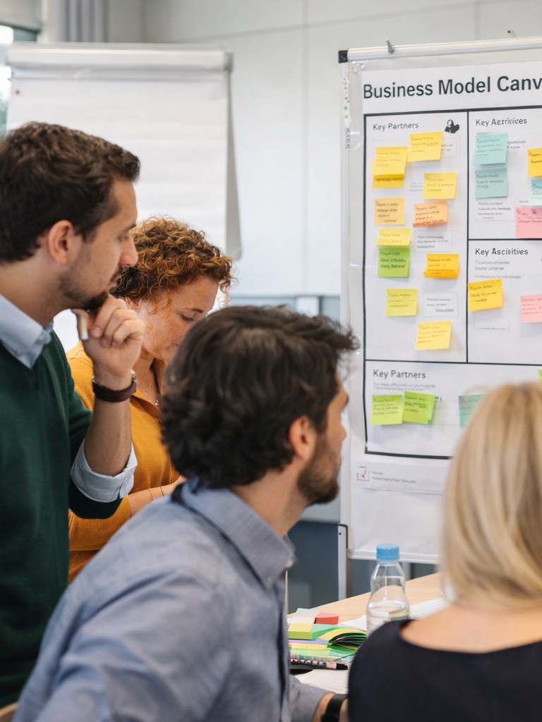 Im ersten Modul entwickelt Ihr mit dem Business Model Canvas Eure strategische Grundlogik und prüfen diese anhand der 55 Geschäftsmodellmuster des St. Galler Business Model Navigators. Typische Denkfehler (z. B. Survivorship Bias oder Sunk Cost Fallacy) werden reflektiert. Im zweiten Modul steht die Kundensicht im Mittelpunkt: Mit dem Value Proposition Canvas schärft Ihr Nutzergruppen, Jobs-to-be-Done und euer Wertversprechen. Im dritten Modul verbinden wir Problemraum, Lösungsraum und Prototyping. Mit Elementen aus Design Thinking, Lean Startup und Pitch-Storytelling entwickeln wir konkrete Angebote oder Produktfeatures. Zwischen den Modulen arbeitet Ihr an realen Anwendungen in eurem beruflichen Kontext.
